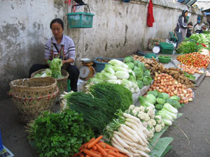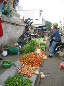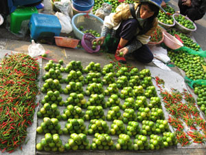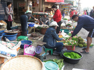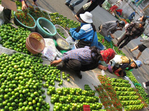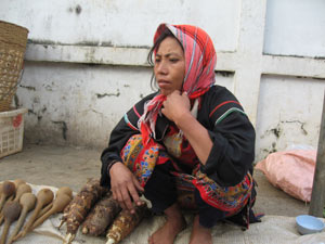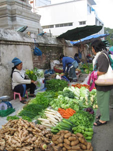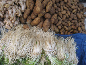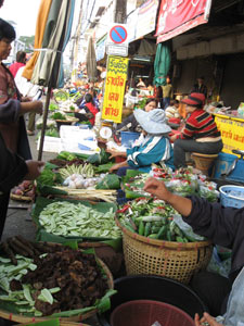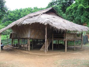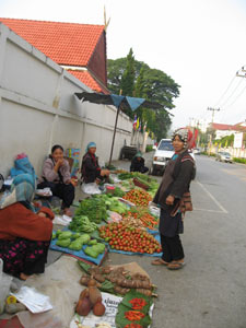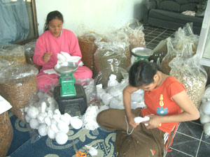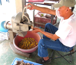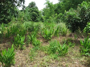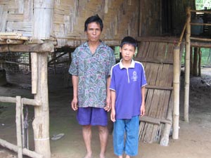 生産農家のアサンさん(左)。主にウコン・ショウガ・レモン グラスなどを栽培しています。隣は息子のマスワイ君(当時12才)。 学校に通いながら休日には お父さんの 仕事 を手伝っています。 |